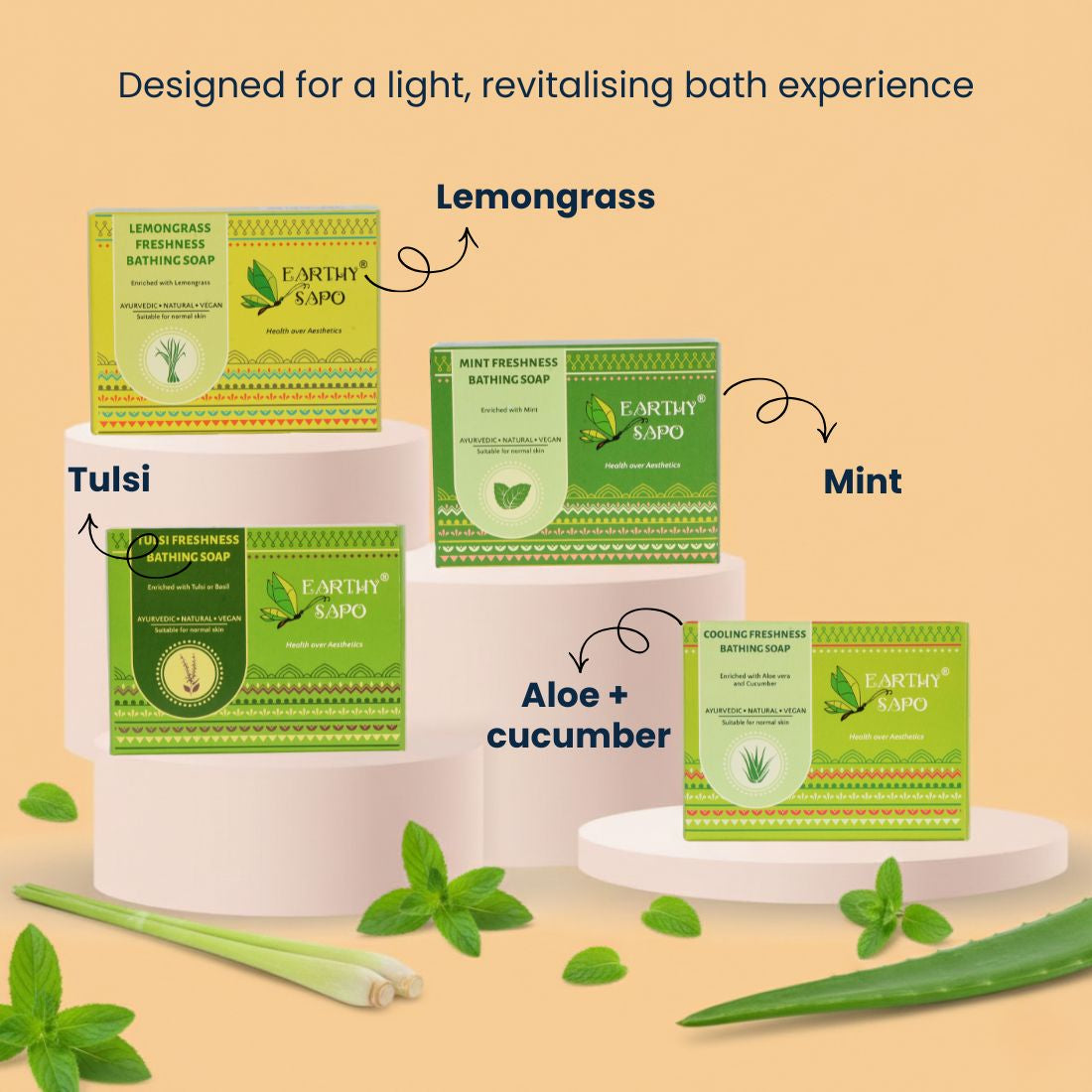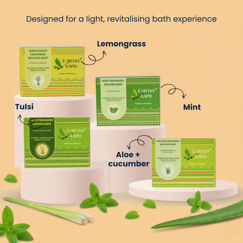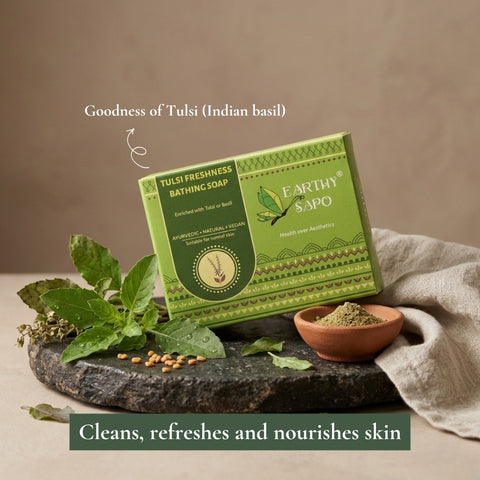 Tulsi Freshness Bathing Soap – Packed with the goodness of tulsi, it purifies and restores skin health.